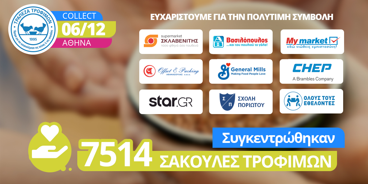 NEWS Collect: Αθήνα 6/12/2019 Updated on 5 Ιουλίου, 2024 by Foodbank Support Collect: Αθήνα 6/12/2019 7.514 προσφορές από όλους εσάς, μέσα σε μία μέρα! Την Παρασκευή 6 Δεκεμβρίου καταφέραμε να συγκεντρώσουμε 7.514 σακούλες με τρόφιμα μακράς διάρκειας! Τις θερμές μας ευχαριστίες στις αλυσίδες supermarket My Market, ΑΒ Βασιλόπουλος, Σκλαβενίτης που μας βοήθησαν στην δράση! στον Σκλαβενίτη που μας προσέφερε και δικά του τρόφιμα! στους εργαζόμενους της General Mills και Chep, και τους μαθητές από την Σχολή Ποριώτου που συμμετείχαν για άλλη μια φορά ως εθελοντές! στην εταιρία Αθανασούλας που μας τύπωσε δωρεάν τις αφίσες! στο star.gr αλλά και στους Ψιθυριστές στον ‘ΘΕΜΑ 104,6’ Φυσικά ευχαριστούμε τους περισσότερους από 400 εθελοντές, που μας βοήθησαν σε όλη την Αθήνα, κι εσάς! [foogallery id=”9036″]