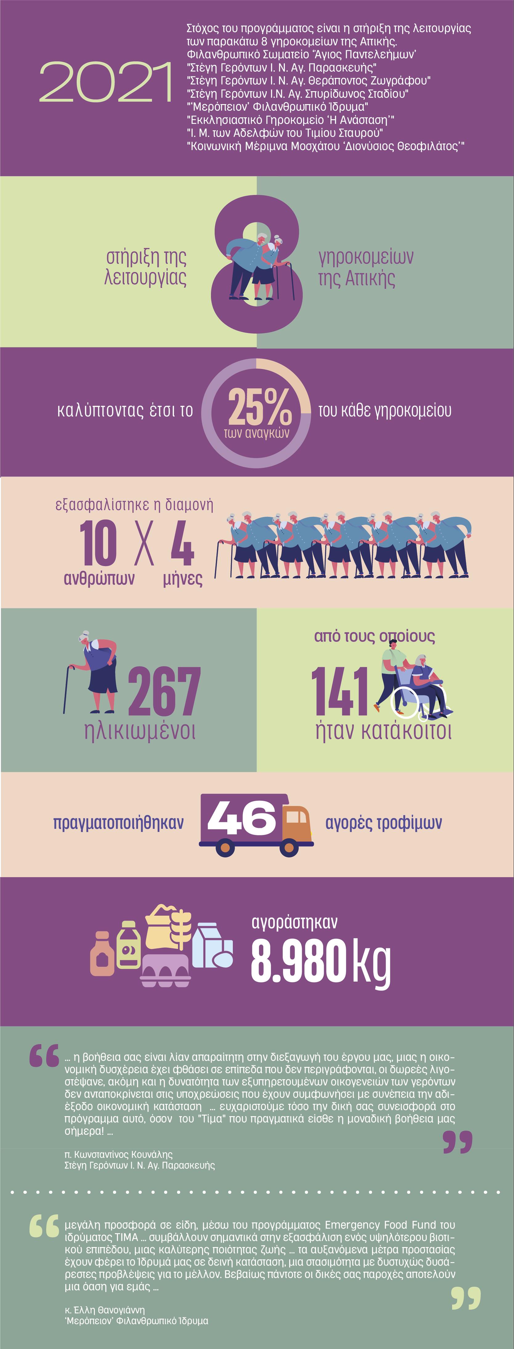 TIMA Public Benefit Foundation remains actively on the side of the Food Bank for another year, helping to cover the food needs of our elderly fellow human beings in 8 nursing homes in Attica for the whole of 2022 through the Emergency Food Fund program.